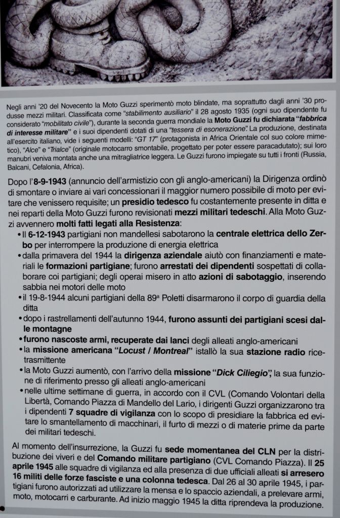 Una nuova targa (sempre con testo anche in inglese) è stata inoltre collocata all’esterno della Moto Guzzi, con il contributo economico dei lavoratori e delle loro rappresentanze sindacali, e non ha mancato di ricevere lusinghieri apprezzamenti dai componenti delle delegazioni europee che hanno soggiornato in riva al Lario l’ultima settimana di aprile, non mancando appunto di apprezzare il lavoro svolto dall’Archivio e dai suoi volontari.