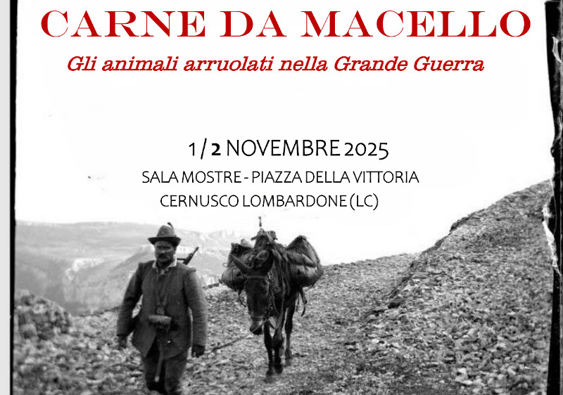 CERNUSCO LOMBARDONE – “Carne da macello”: è il titolo della mostra che verrà allestita sabato 1 e domenica 2 novembre nella sala mostre in piazza della Vittoria. L’iniziativa porta la firma di Punto Rosso insieme al gruppo alpini e vuole offrire un’occasione per parlare, tramite un centinaio di foto su pannelli raccolte dalla storica Serenella Ferrari, degli animali impiegati nella prima guerra mondiale.