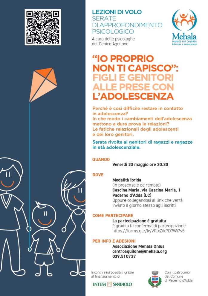 PADERNO D’ADDA – L’Associazione Mehala Onlus promuove da diverso tempo il programma “Lezioni di volo – serate di approfondimento psicologico“, una serie di serate condotte dalle psicologhe di Aquilone – Servizio di supporto psicologico su diversi temi che molte volte richiedono opinioni di personale esperto.