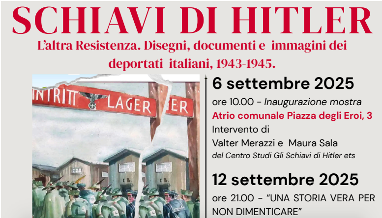 MERATE – Raccontare la storia e le testimonianze di chi venne deportato nei campi di concentramento perché si rifiutò di arruolarsi con i nazifascisti. Verrà inaugurata sabato 6 settembre la mostra “Schiavi di Hitler. L’altra Resistenza. Disegni, documenti e immagini dei deportati italiani, 1943-1945″, iniziativa promossa dall’assessorato alla Promozione Culturale e Turistica in occasione della giornata in memoria degli internati italiani nei campi di concentramento tedeschi durante la seconda guerra mondiale che si celebra il 20 settembre.