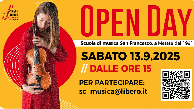 MERATE – Open day sabato 13 settembre della scuola di musica San Francesco. L’appuntamento è dalle 15 alle 17 quando sarà possibile visitare e conoscere la scuola e gli insegnanti. La direzione e i docenti offriranno piccole lezioni di prova e dimostrative, fornendo anche tutte le informazioni utili.