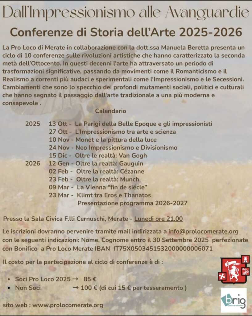 La prima conferenza si terrà lunedì 13 ottobre e verterà sulla Parigi della Belle Epoque e sugli impressionisti. Le iscrizioni verranno raccolte fino al 30 settembre tramite mail indirizzata a info@prolocomerate.it Il costo è di 85 euro per i soci e di 100 euro per i non soci (comprensivi della tessera all’associazione).