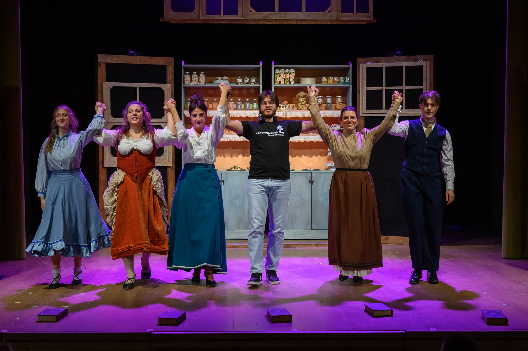 Sul palco si sono distinti Gianmarco Volza nel ruolo dell’ossequioso Oliver; Eleonora Capobianco nei panni della simpatica Mrs. Mary White; Sara Mosca, l’algida e severa Mrs. Peach; Chiara Falagario nel ruolo della giovane e fresca Sophie e Sara Tomasicchio che ha interpretato la roboante Mrs. Tracy Brown. Alla regia lo stesso autore dello spettacolo, il giovane Alessandro Iacovelli che con dovizia e maestria, coadiuvato dal vocal coach e tecnici di scena, ha realizzato uno spettacolo fluido, evitando cali di tensione, con un utilizzo di luci, scenografie e coreografie decisamente valido.