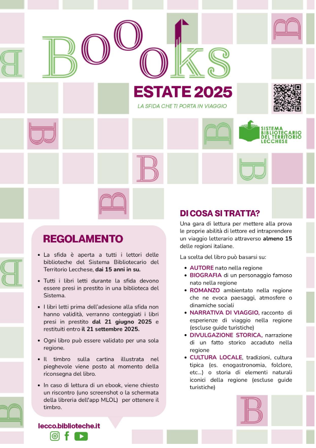 Visto il successo dell’iniziativa il Sistema Bibliotecario del Territorio Lecchese ha pensato di riproporre la challenge anche per l’estate 2025. A partire dal 21 giugno e fino al 21 settembre i partecipanti potranno intraprendere un viaggio di letture e approfondimenti attraverso 15 regioni italiane. Ad ogni lettore viene assegnato un passaporto e per ogni “destinazione” raggiunta verrà apposto un timbro.
