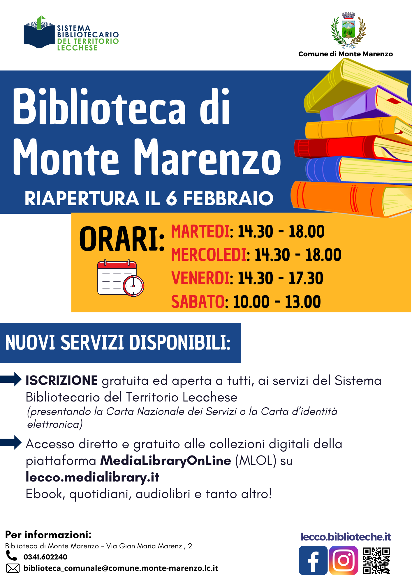 Dopo la riapertrura del 6 febbraio scorsi, la biblioteca questa mattina ha ufficializzato l’adesione del servizio al Sistema Bibliotecario del territorio lecchese. Gli utenti potranno usufruire pertanto del prestito interbibliotecario e avere accesso diretto e gratuito alle collezioni digitali della piattaforma MediaLibraryOnLine (MLOL) su lecco.medialibrary.it dove si trovano Ebook, quotidiani, audiolibri e tanto altro.