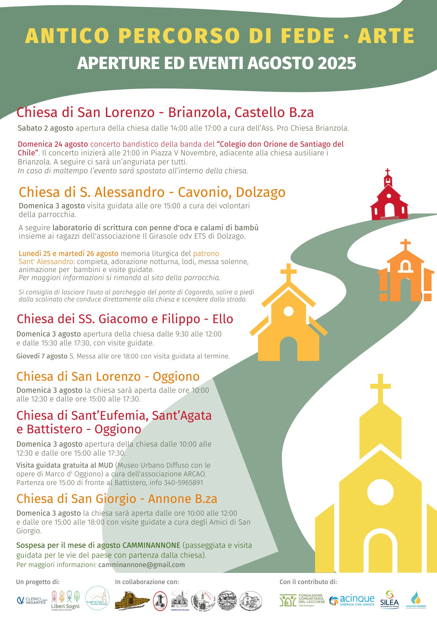 Tra questi, spiccano Clerici Vagantes insieme a Pro Loco e al gruppo Arcao di Oggiono, gli Amici della Chiesa di San Giorgio di Annone, l’Associazione Chiesa Santi Giacomo e Filippo di Ello, il gruppo di volontari della parrocchia di Dolzago, l’Associazione Pro Chiesa di Brianzola di Catello, i volontari di Colle Brianza e la cooperativa sociale Liberi Sogni.