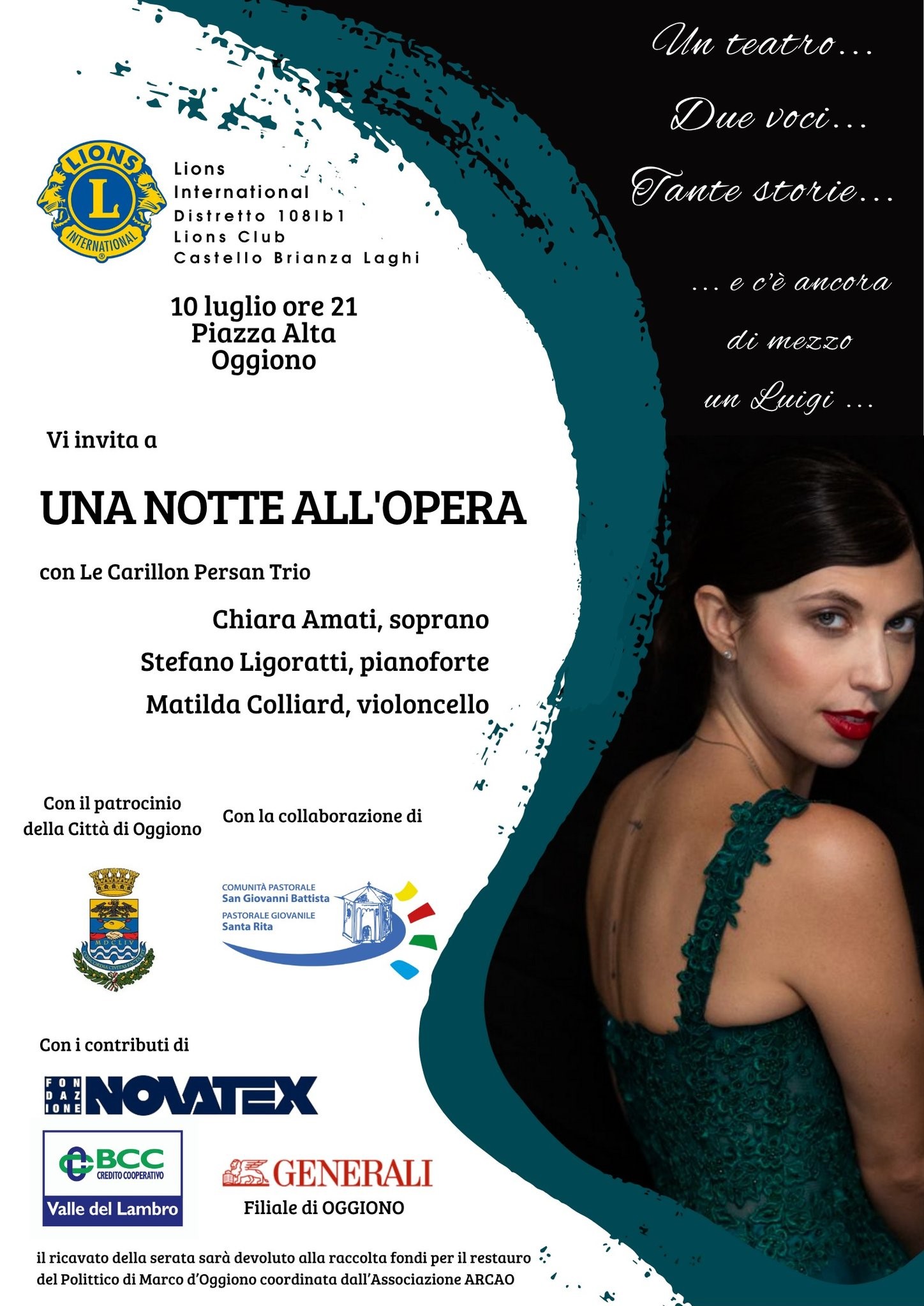 OGGIONO – Il Lions Club Castello Brianza Laghi promuove il recital teatrale e musicale dal vivo “Una notte all’opera”, un appuntamento culturale di grande suggestione realizzato con il contributo della Fondazione Novatex, di BCC Credito Cooperativo Valle del Lambro, di Assicurazioni Generali – filiale di Oggiono e di Cattaneo Grafiche. L’iniziativa è organizzata in collaborazione con don Maurizio Mottadelli e la Comunità Pastorale San Giovanni Battista di Oggiono, con il patrocinio della Città di Oggiono.