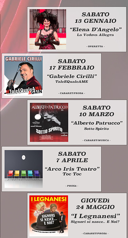 Sabato 17 febbraio sarà la volta del comico televisivo Gabriele Cirilli che porterà al cineteatro di via Manzoni “Tale e quale a me”, recital scritto dallo stesso Cirilli con Maria Deluca, Giorgio Ganzeerli e Andrea Midena; uno show adatto ad ogni gusto, con il noto attore che darà il meglio del suo repertorio, con nuovi monologhi e gag irresistibili.