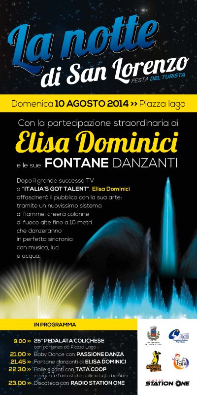 COLICO – Da Italia’s got talent arriva Elisa Dominici per la Festa di San Lorenzo la prossima domenica 10 di agosto: il suo spettacolo di musica, luci e giochi d’acqua “Fontane Danzanti” animerà la città nei pressi della Piazza Lago, grazie all’iniziativa della Pro Loco Colico che per l’occasione ha pensato ad una serie di eventi per grandi e piccini.