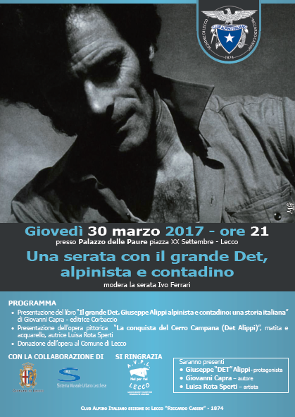 Durante la serata che vedrà nelle vesti di moderatore un altro grande alpinista, Ivo Ferrari, verrà presentato il libro “Il grande DET. Giuseppe Alippi alpinista e contadino. Una storia italiana”, di Giovanni Capra, edito da Corbaccio e il dipinto “La conquista del Cerro Campana” (gennaio – febbraio 2006, 72×102 cm) realizzato e donato al Comune di Lecco dall’artista Luisa Rota Sperti.