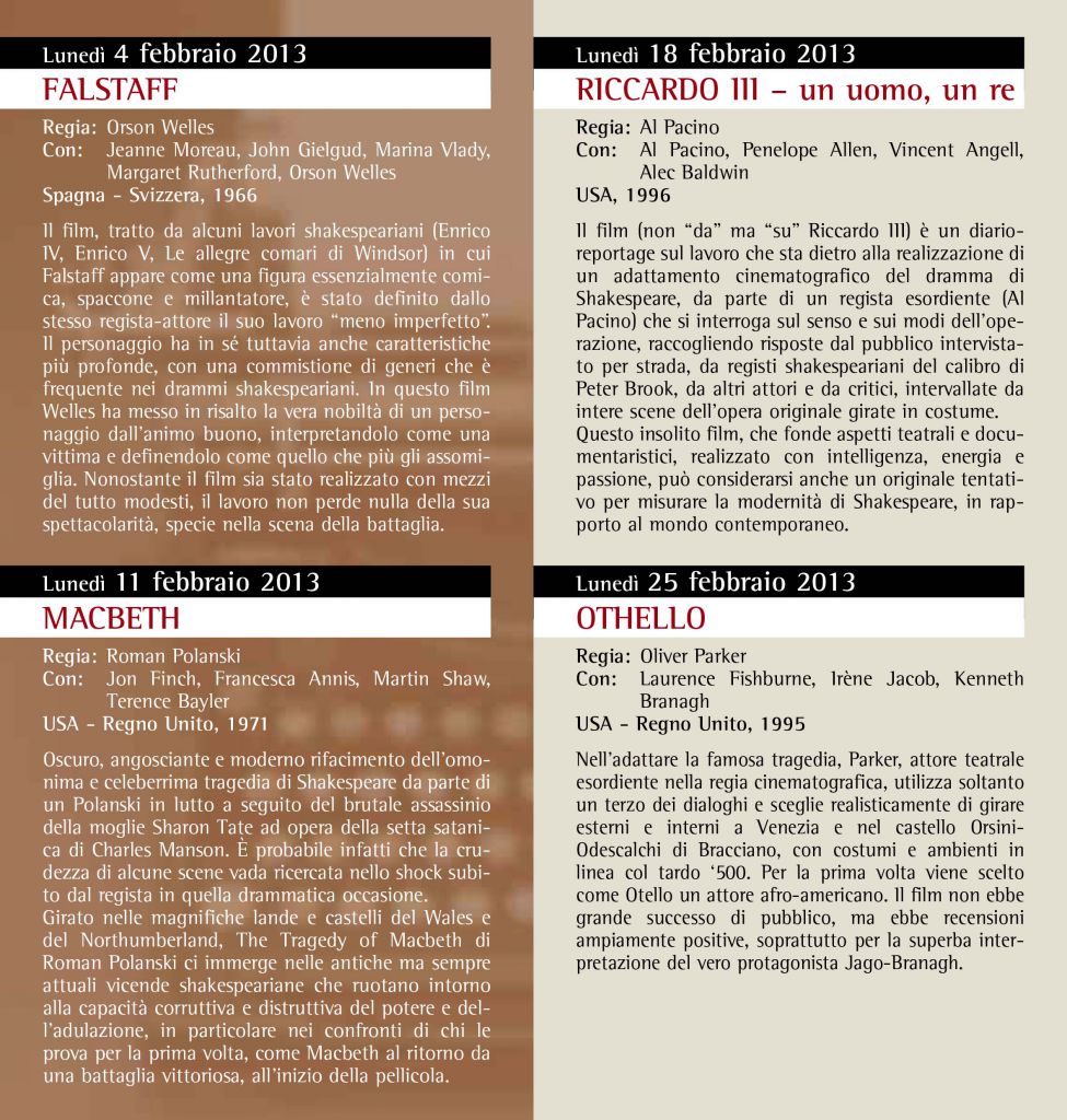 Si parte, infatti, il prossimo lunedì 4 febbraio con il “Falstaff” di Orson Welles, un film girato nel 1966 e che prende spunto da opere quali Enrico IV, Enrico V e Le allegre comari di Windsor. Tra gli attori Jeanne Moreau, John Gielgud, Marina Vlady, Margaret Rutherford e lo stesso regista.