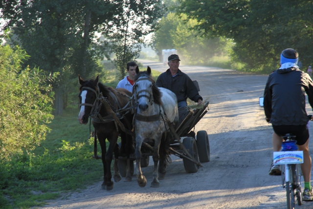 “Finalmente l’Ucraina ci mostra i suoi grandi orizzonti infiniti. Un continuo susseguirsi di dolci colline mettono a dura prova le nostre gambe. Immensi campi di granoturco, frumento, grano saraceno allietano la nostra vista durante la corsa. La città di Berezhany che attraversiamo velocemente è una tipica città dal sapore quasi orientale, mercati colorati, strade disastrate e polverose percorse da vetusti camion che emettono nuvole irrespirabili di gas di scarico e carretti trainati da cavalli. Primo incidente tecnico: foratura bici. Avevamo detto che era un viaggio tra nuvole, bambole e arcobaleni; oggi le nuvole erano tante, bianche ed enormi e abbiamo iniziato a vedere anche le prime bambole. Tra qualche giorno vedremo gli “arcobaleni” “.