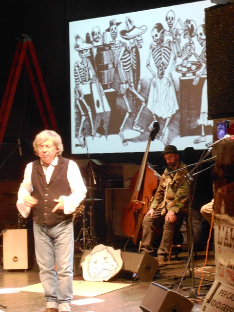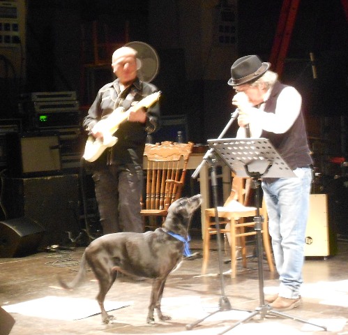 Il tutto, per concludere, in una scenografia spoglia, che ben ha reso l’idea di un work in progress: la mancanza di quinte, una serie di attrezzi sparsi per il palco, una scala, un ventilatore, un fornelletto per cucinare e innumerevoli fogli del canovaccio, letti da Rossi e lasciti cadere per terra, hanno infatti contribuito a creare la giusta atmosfera per uno spettacolo esilarante, che non ha smesso di intrattenere il pubblico neppure durante quello che sarebbe dovuto essere l’intervallo. Niente sipario chiuso, infatti: Rossi e i musicisti hanno dialogato con i presenti, offerto la zuppa di fagioli, scherzato e ricordato che “non è la televisione, qui non c’è uno schermo che ci separa”.