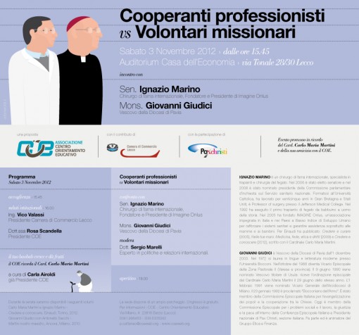“La morte del Cardinale Martini ci ha toccato molto” sottolinea Rosa Scandella, Presidente del COE “noi abbiamo avuto modo di conoscerlo bene in quanto Don Pedretti, il nostro Fondatore, aveva instaurato con il Cardinale un rapporto di amicizia e stima profonde. È venuto più volte nelle nostre diverse sedi in Lombardia ed anche in alcuni paese africani dove noi operiamo come Ong cristiana. Il suo testamento è grande e noi attraverso l’incontro di sabato 3 vogliamo ricordarlo con due persone che hanno lavorato e riflettuto con lui: il Sen. Ignazio Marino con il quale ha scritto il bellissimo volume “Credere e conoscere” (Einaudi, 2012), oggi presidente di Imagine Onlus che opera in Africa con progetti sanitari di eccellenza e con Mons. Giovanni Giudici che è stato membro della Commissione Episcopale Italiana per l’evangelizzazione dei popoli e la cooperazione tra le Chiese e che è stato amico di Don Pedretti”. L’incontro è gratuito ed è aperto a tutti.