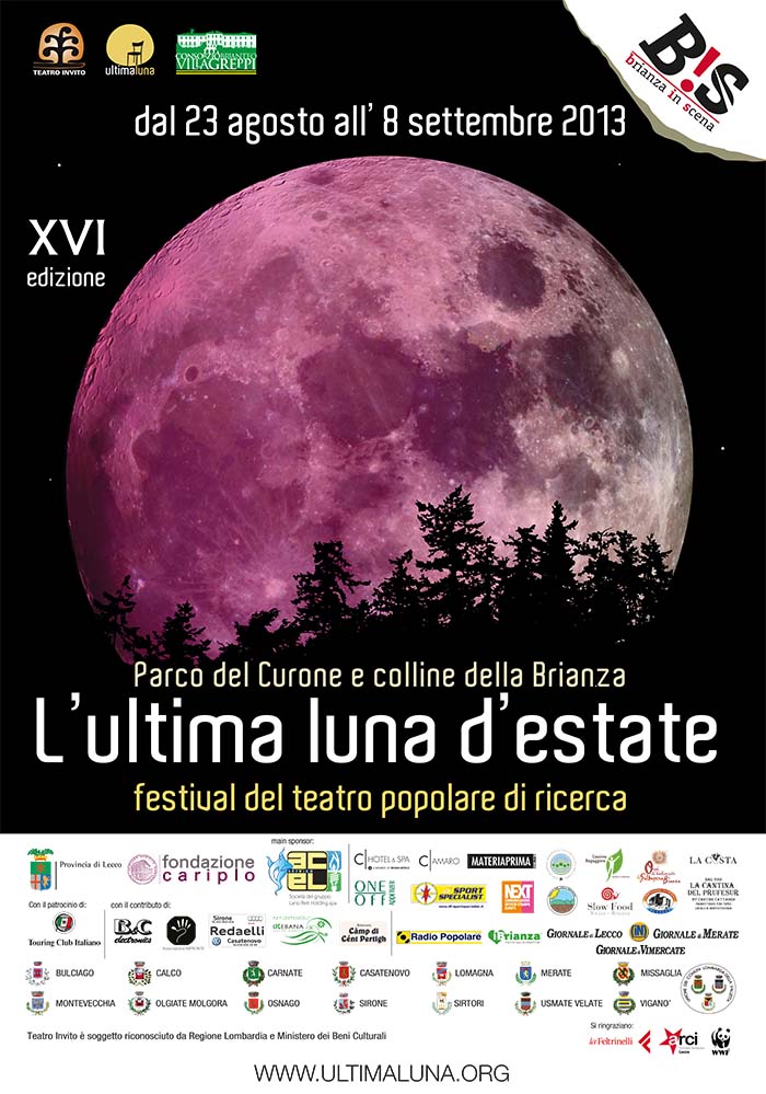 BRIANZA – Ormai è una tradizione: ogni estate ha la sua “ultima luna”. Ed è così che per il sedicesimo anno consecutivo torna, infatti, “L’Ultima luna d’estate”, il festival di teatro popolare di ricerca organizzato da Teatro Invito e che dal 23 di agosto all’8 di settembre proporrà spettacoli, aperitivi teatrali, laboratori e musica in alcune delle più suggestive location della Brianza. Diciassette giorni in tutto, quindi, durante i quali le ville, le corti, le aie e altri luoghi come chiesette e cascine della Brianza lecchese e monzese accoglieranno un calendario di eventi che “nonostante la crisi e le numerose difficoltà incontrate durante l’organizzazione del festival – afferma il direttore artistico, Luca Radaelli – non mancherà di sorprendere”. Fulcro della rassegna, come sempre, il Parco Regionale di Montevecchia e Valle del Curone e il Parco dei Colli Briantei, un’ambientazione “ricca di luoghi bellissimi – riprende Radaelli – e che meritano di essere scoperti e riscoperti”.
