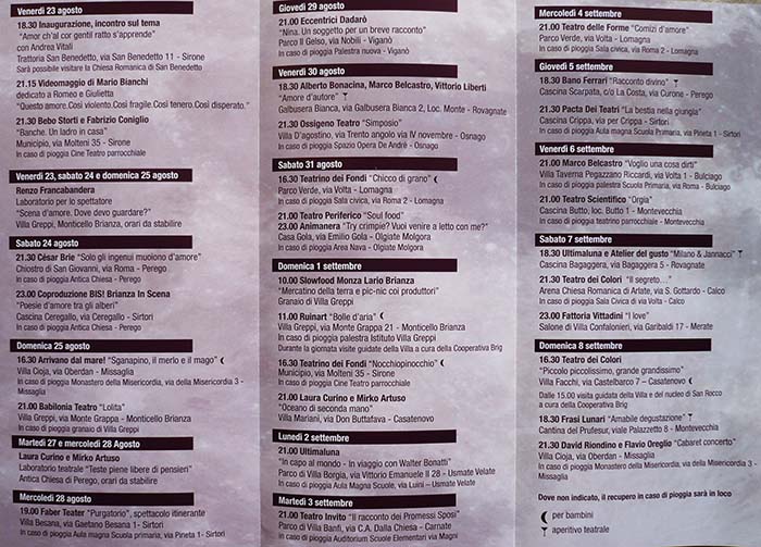 Dopo il successo all’ultimo Festival di Napoli, arriva in Brianza anche “Lolita” di Babilonia Teatro (il 25 agosto a Monticello Brianza), mentre con lo spettacolo di danza “I love” di Fattoria Vittadini (7 settembre a Merate) “intendiamo passare il testimone – annuncia Radaelli – al prossimo festival di danza contemporanea “Caffeine” di Piccoli Idilli, insieme a Teatro Invito e a Scarlattine Teatro parte del progetto Bis! Brianza in scena”. E poi ancora due omaggi a Pasolini con la rappresentazione di “Orgia” e con “Comizi d’amore”, numerosi aperitivi teatrali con degustazione di prodotti del territorio, eventi dedicati ai bambini e, infine, il grande appuntamento di chiusura, quando la Villa Cioja di Missaglia accoglierà il “Cabaret concerto” di David Riondino e Flavio Oreglio (domenica 8 settembre).