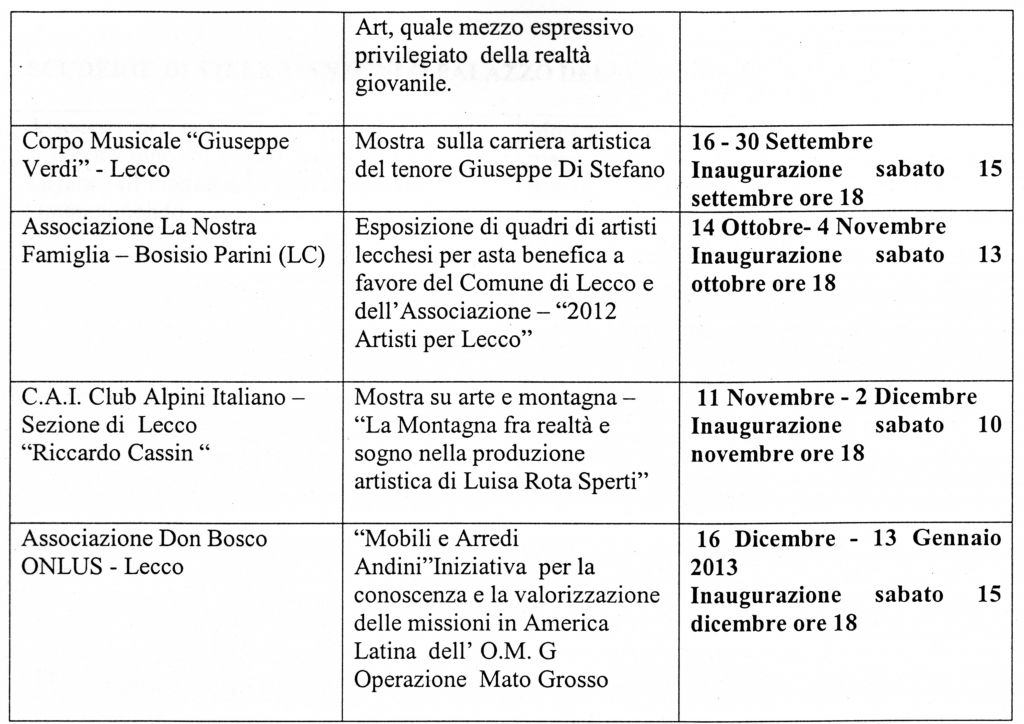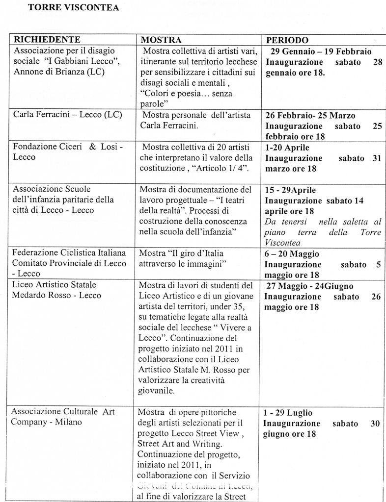 Associazioni di volontariato, artisti, studenti. Tutti coinvolti in prima persona per dare forma, insieme al Comune di Lecco, al calendario di mostre che per l’intero 2012 si susseguiranno all’interno dei prestigiosi spazi della Torre Viscontea, in piazza XX Settembre.