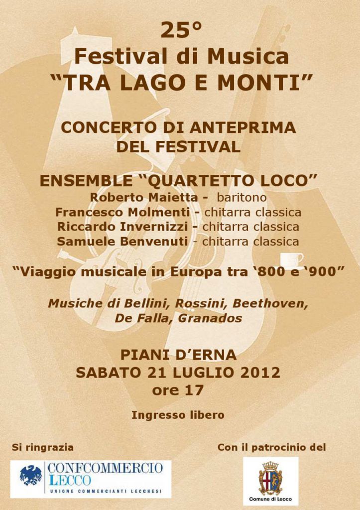 LECCO – Il concerto di anteprima della venticinquesima edizione del Festival di musica “Tra lago e monti”, in programma dall’8 al 25 agosto, si terrà questa sera, sabato 21 luglio, ai Piani d’Erna, con l’Ensemble “Quartetto Loco”.