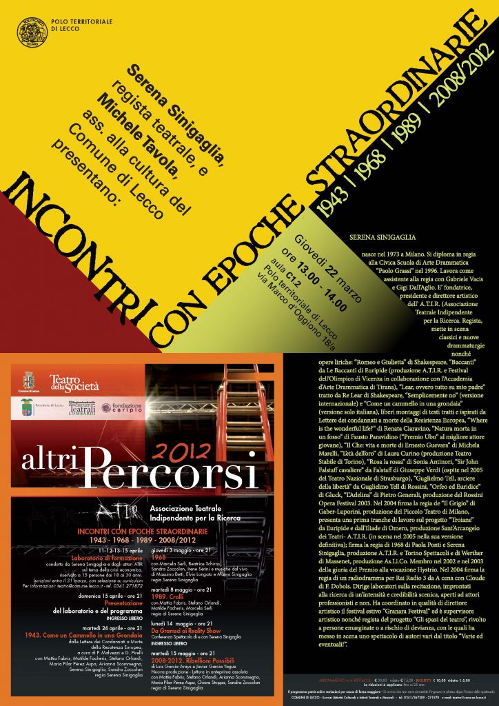 LECCO – Alla presenza della regista Serena Sinigaglia, giovedì 22 marzo alle 13 presso l’aula C1.2 della sede lecchese del Politecnico di Milano (via Marco d’Oggiono, 18/a), l’assessore alla Cultura Michele Tavola presenterà il programma del progetto “Altri Percorsi”. La rassegna teatrale, ospitata dal Teatro della Società di Lecco, che rientra nei Circuiti Teatrali Lombardi promossi da Provincia e Fondazione Cariplo, partirà mercoledì 11 aprile con un laboratorio formativo e si concluderà martedì 15 maggio alle 21 con l’anteprima “2008-2012. Ribellioni Possibili” della regista Sinigaglia.
