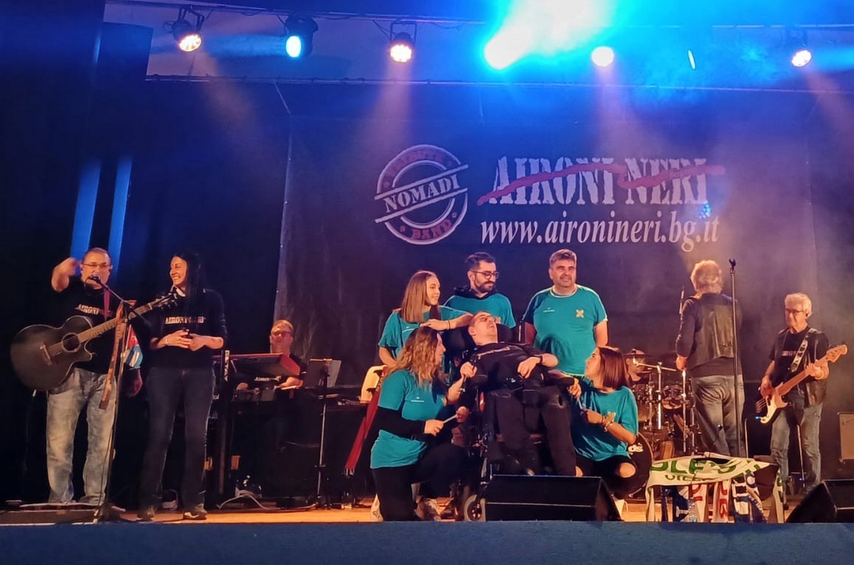VALMADRERA – Un cinema teatro di Valmadrera pressoché pieno ha accolto con entusiasmo, sabato 8 novembre, una serata di musica con particolare attenzione al tema della disabilità. Il famoso gruppo musicale “Aironi neri”, con la presenza del loro amico Andrea Gentileschi, promotore della serata, hanno intrattenuto il numeroso pubblico con lo storico repertorio dei “Nomadi ” con i grandi successi come “Io vagabondo” e “Dio è morto”.