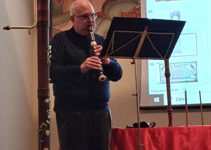 Di fronte a una sala gremita, il Prof. Sansone ha ripercorso l’evoluzione e la fortuna del flauto dolce nel corso della storia, esplorando i secoli e i luoghi in cui quest’arte ha prosperato. Partendo dai reperti archeologici di oltre 5 mila anni fa realizzati con ossa animali, ha illustrato come questo affascinante strumento abbia raggiunto il suo apice tra il XVII e il XIX secolo, evolvendosi in diverse forme e diffondendosi principalmente in Inghilterra, Germania, Olanda, Belgio e Francia.
