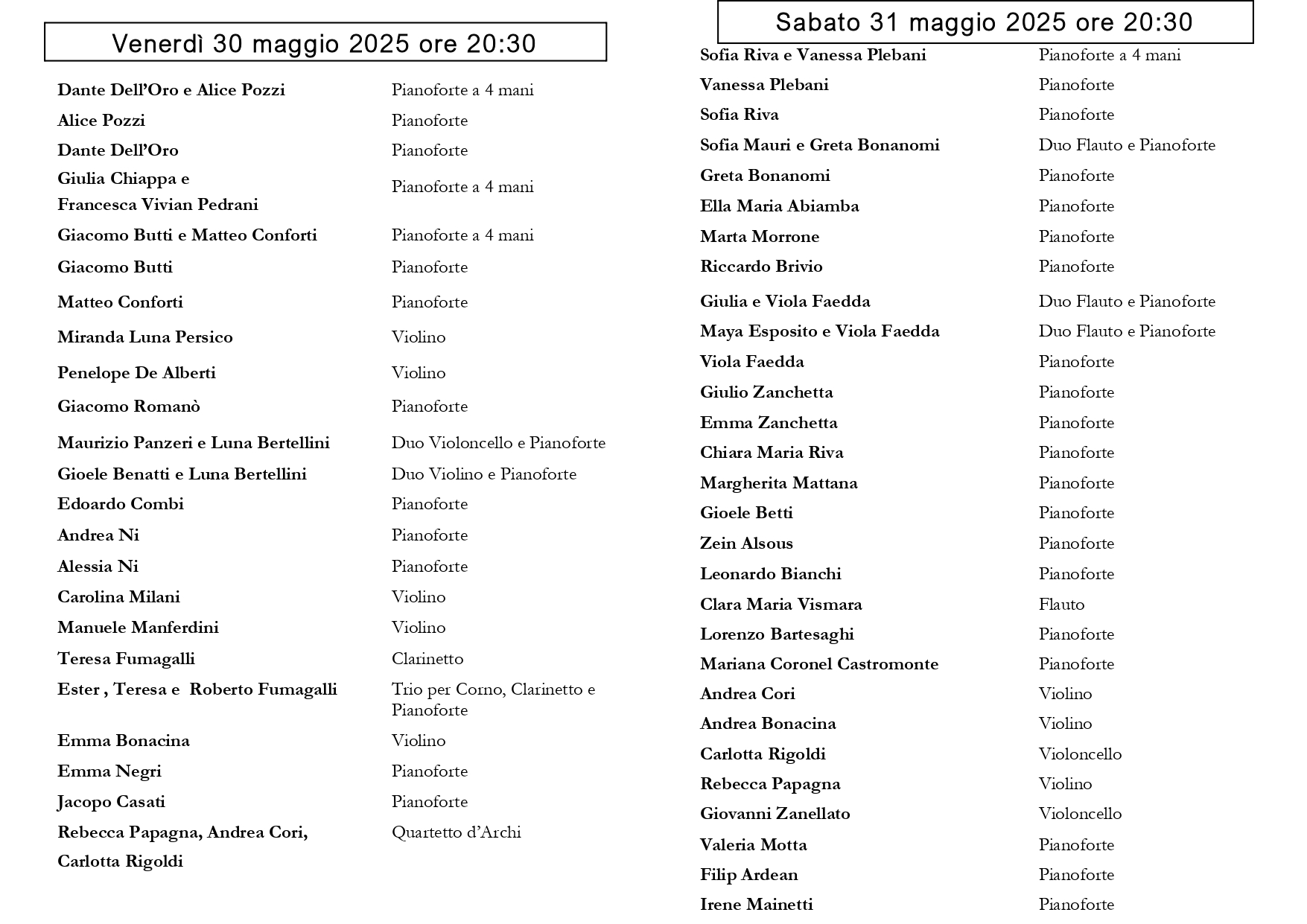 L’edizione di quest’anno vedrà esibirsi ben 50 musicisti che suoneranno diversi strumenti: pianoforte, violino, violoncello, clarinetto, corno, flauto traverso. Provengono dal Liceo Musicale Grassi di Lecco, dalla Scuola di Musica del Corpo Musicale “Santa Cecilia” di Valmadrera, dalla Scuola Civica di Lecco, dal Conservatorio di Como, da insegnanti Privati.