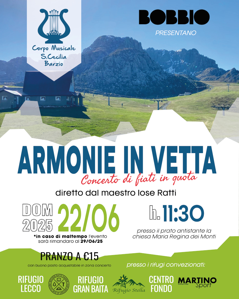 BARZIO – L’estate musicale 2025 del Corpo Musicale Santa Cecilia di Barzio, si apre con il debutto di un nuovo evento: “Armonie in Vetta – Concerto di fiati in quota”. L’iniziativa, organizzata in collaborazione con ITB Piani di Bobbio, si terrà nella suggestiva e panoramica location dei Piani di Bobbio, offrendo un’esperienza sensoriale e musicale indimenticabile al pubblico, che la vivrà circondato dalle meraviglie delle nostre montagne, con una vista mozzafiato e l’aria fresca dell’estate.