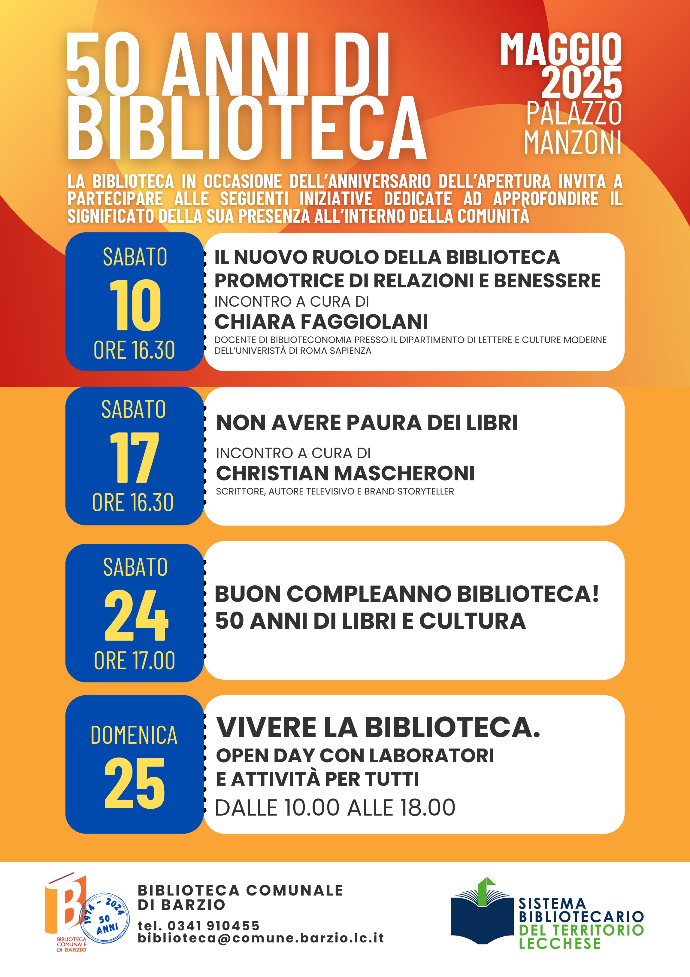 Infine domenica 25 maggio, a chiusura di un anno di festeggiamenti iniziato il 15 febbraio 2024 con la ricorrenza del giorno della fondazione, le porte di Palazzo Manzoni e della Biblioteca resteranno aperte lungo la giornata in un open day che prevede diverse iniziative rivolte a bambini, ragazzi e adulti. La partecipazione a tutte le attività è gratuita e aperta a tutti.