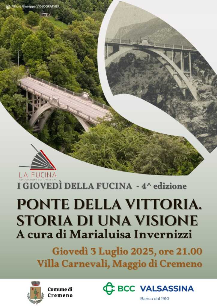 CREMENO – Nella splendida cornice di Villa Carnevali, giovedì 3 luglio, si terrà un’interessante conferenza storica sull’origine del Ponte della Vittoria che collega i paesi di Cremeno e Maggio organizzata dal comune in collaborazione con la BCC della Valsassina.