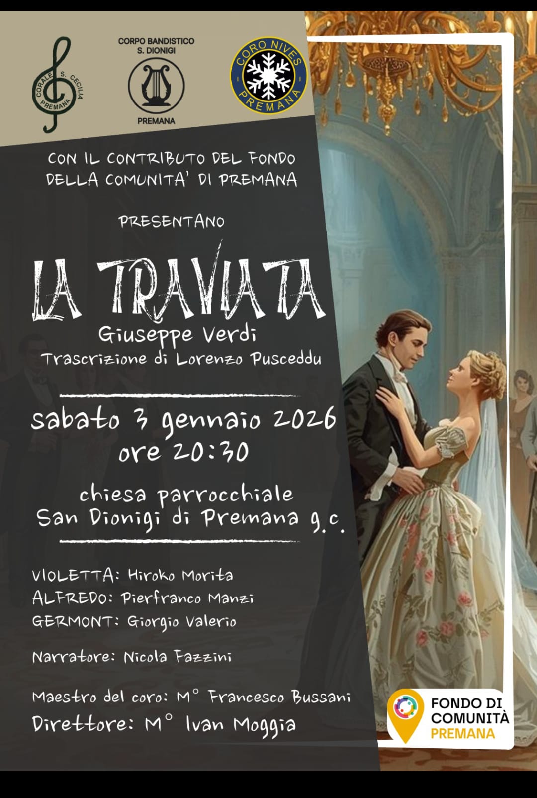 PREMANA – Premana si prepara ad accogliere un appuntamento musicale di rilievo che unisce lirica e dimensione comunitaria. Le realtà musicali del territorio, con il contributo del Fondo della Comunità di Premana, presentano “La Traviata” di Giuseppe Verdi, in una versione con trascrizione di Lorenzo Pusceddu, proposta in un contesto accessibile e vicino al pubblico locale.