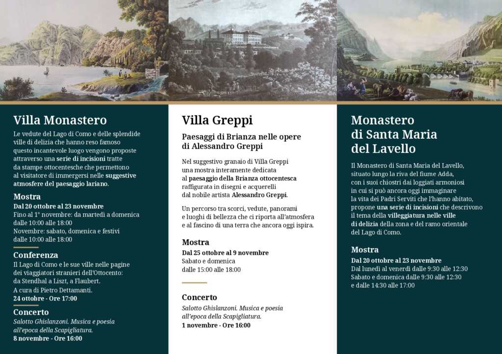 Le iniziative saranno arricchite dalla conferenza, a cura di Pietro Dettamanti, “Il Lago di Como e le sue ville nelle pagine dei viaggiatori stranieri dell’Ottocento: da Stendhal a Liszt, a Flaubert”, in programma il 24 ottobre alle 17 nella sala Fermi, e da due concerti dal titolo “Salotto Ghislanzoni. Musica e poesia all’epoca della Scapigliatura”, in programma il 1° novembre alle 16 nel granaio di Villa Greppi e l’8 novembre alle 16 a Villa Monastero.