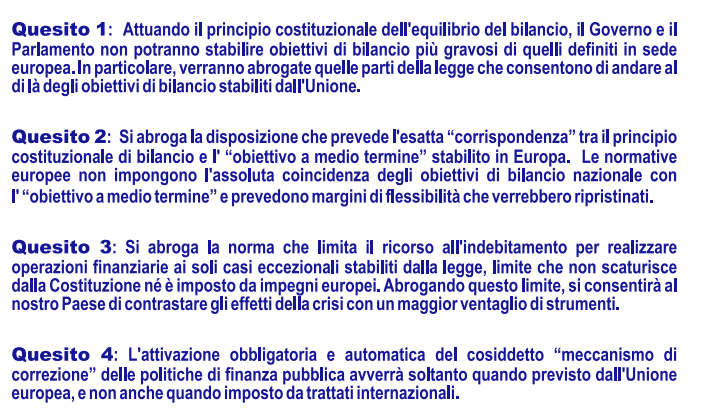 I quattro quesiti vogliono abrogare alcuni passaggio della legge 243 del 2013 che, come spiegato dai promotori della raccolta firme, imporrebbero vincoli aggiuntivi rispetto alle normative europee e al Fiscal Compact.