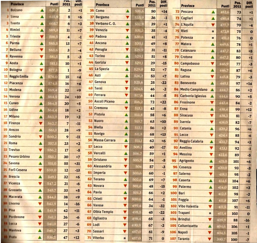 Ad aggiudicarsi il podio è invece la provincia di Bolzano, seguita da Siena e Trento, ultime invece Caltanissetta, Napoli e Taranto.