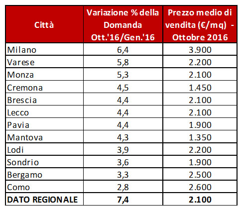 Milano(3.900 €/mq) e Como (2.600 €/mq) sono le città più care, mentre Mantova (1.350 €/mq) e Cremona (1.450 €/mq) le più economiche. Nelle altre città, a Bergamo il costo è di 2.500 €/mq, a Varese e Lodi di 2.200 €/mq, a Brescia, Monza di 2.100 €/mq, a Pavia e Sondrio di 1.900 €/mq.