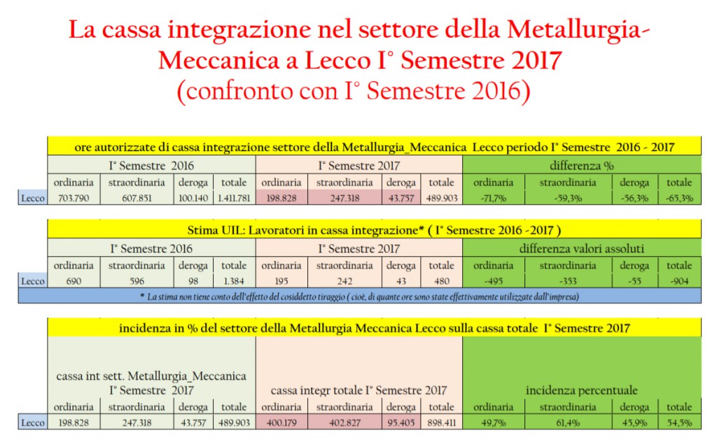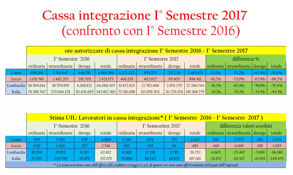 Prendendo in riferimento il primo semestre del 2017 e confrontato con lo stesso periodo dell’anno scorso si rileva che in Provincia di Como la cassa integrazione ordinaria è cresciuta del 32,9%, mentre, a Lecco è diminuita del 61,2%, in Lombardia -36,3% e in Italia – 28,1%.