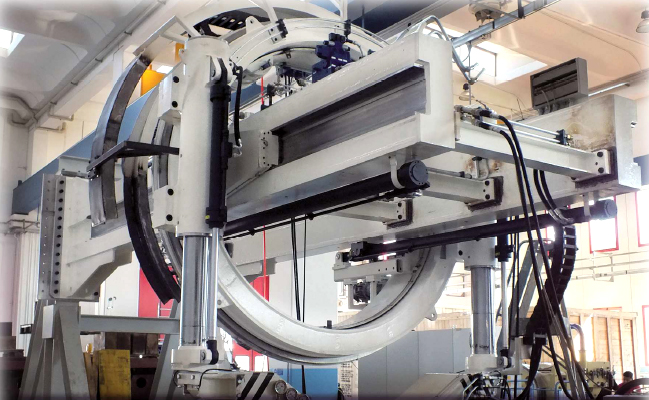 L’erettore è composto da una struttura fissa e una mobile, realizzate entrambe in carpenteria elettrosaldata e lavorate su macchine utensili. La parte fissa è costituita da due travi longitudinali sulle quali sono montate le guide di scorrimento, realizzate in materiale antiusura. La parte mobile invece è costituita dall’anello traslante, rotante e dal gruppo pinza.