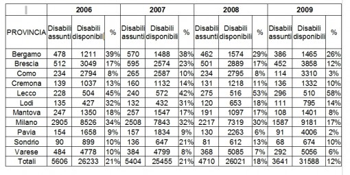 Lecco prima provincia in Lombardia nel collocamento dei disabili. L’assessore al Mercato del Lavoro Fabio Dadati esprime la sua soddisfazione nel riscontrare che nella 5^ Relazione sullo stato di attuazione della Legge 68/99 per il Collocamento Disabili, trasmessa al Ministero del Lavoro, la Regione Lombardia sottolinea che il rapporto percentuale fra numero degli iscritti disponibili e numero degli assunti nel 2009 ha subito una diminuzione più o meno accentuata in tutte le Province lombarde a eccezione di Lecco.