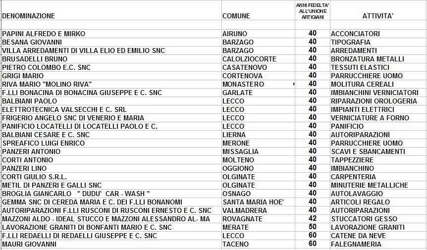 Al termine dell’assembplea si sono svolte le premiazioni. Di seguito l’elenco di tutti i premiati che hanno ricevuto il riconoscimento di 40, 42, 50 e 60 anni di fedeltà alla Confartigianato.