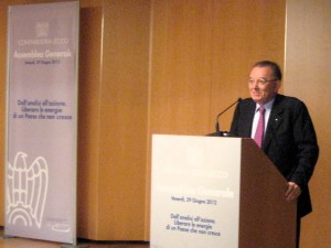 Mentre il presidente Giorgio Squinzi ha aperto il suo discorso sottolineando: “L’Italia è fatta di imprese speciali che chiedono un paese normale”, mostrandosi pessimista quando ha snocciolato i risultati economici di quest’anno : “Credo che nel corso dell’anno aggiungeremo qualche decimale negativo alle stime del nostro Pil 2012 rispetto al -2,4% atteso dal Centro Studi di Confindustria. Sono stato accusato di catastrofismo sui giornali, ma onestamente non lo credo. La situazione economica reale è sotto gli occhi di tutti, ed è una situazione disperata”.