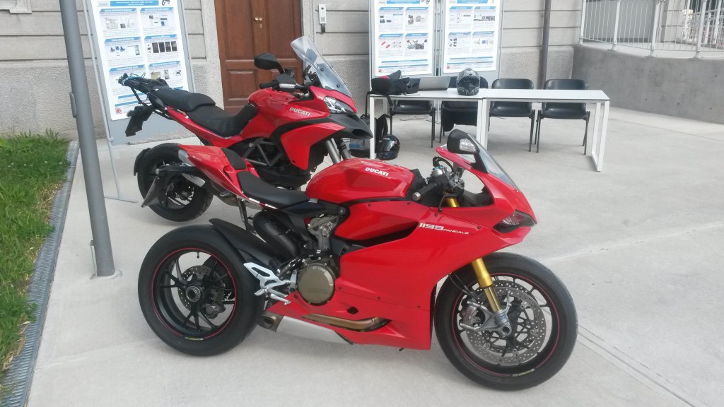 I giovani laureandi hanno allestito due moto della casa motociclistica bolognese una versione sportiva, la 1199 Panigale/S e una Multistrada “testastretta” 1200 su cui gli studenti hanno fatto le loro importanti applicazioni per lo studio dell’analisi.