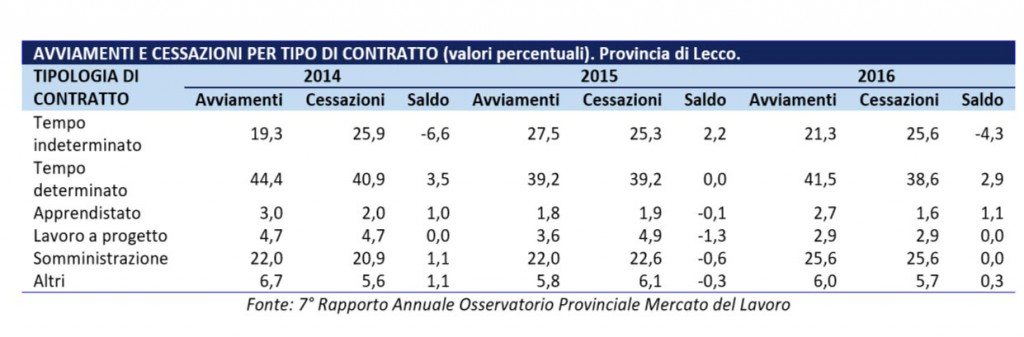 I minori incentivi economici previsti a favore delle imprese per il 2016 hanno diminuito in misura rilevante la quota di avviamenti con contratto a tempo indeterminato, passati dal 27,5% del 2015 al 21,3% nel 2016 (in valori assoluti, da oltre 9.600 unità a poco più di 7.000); stabile la quota di cessazioni di rapporti a tempo indeterminato rimasta intorno al 25%. È aumentata (dal 39,2% al 41,5%) la quota percentuale degli avviamenti a tempo determinato (anche se è rimasta stabile intorno alle 13.800 unità in valori assoluti). Una quota significativa degli avviamenti al lavoro di residenti in provincia di Lecco è avvenuta in imprese che operano al di fuori del territorio provinciale;