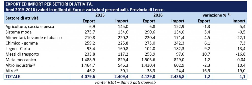 L’export lecchese è aumentato dell’1,2%; l’import è cresciuto dell’1,1%; la bilancia commerciale è positiva per ben 1,69 miliardi di Euro (+1,3%). Nel primo trimestre 2017 le esportazioni in provincia hanno stabilito un record, superando miliardo di euro (1,1 miliardi di Euro, +11,3% rispetto allo stesso periodo dello scorso anno).