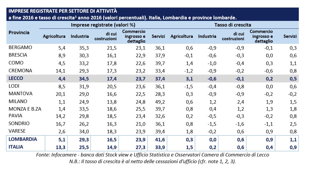 A fine 2016 le imprese e le unità locali lecchesi erano circa 33.400, ne sono nate 1.459 imprese e ne sono cessate 1.415. In calo i fallimenti (65 , -12,2%).