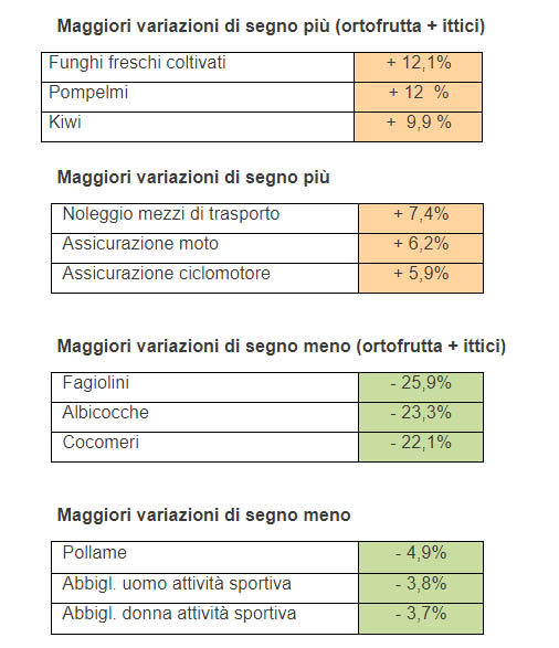 Calano i prezzi degli alimentari (-0,4%): più classi di prodotto risultano artefici di questo calo, in particolare la Frutta(-4%) e i Vegetali (-1,5%) interessati da molteplici prodotti sia stagionali (rilevati in piena stagione) che non stagionali (rilevati tutto l’anno) che registrano prezzi in promozione o addirittura ribassati, tra l’altro i prodotti in diminuzione sono decisamente maggiori di quelli in aumento. Anche carni e pane e cereali risultano in diminuzione di poco più di mezzo punto percentuale.