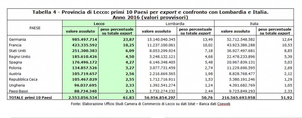 “Nel 2016 le esportazioni della nostra provincia sono state pari a 4,13 miliardi di euro (+1,2% rispetto al 2015, contro il +0,8% lombardo e il +1,2% italiano). Le importazioni ammontano a 2,44 miliardi di euro (+1,1%, a fronte del -1,3% regionale e nazionale) . Il manifatturiero, e in particolare il settore metalmeccanico, rimane il ‘cuore pulsante’ della nostra economia: oltre un terzo delle esportazioni e delle importazioni ha riguardato la meccanica, quota di gran lunga superiore al dato regionale e nazionale (Lombardia: 10% per l’import e 15% per l’export; Italia: entrambi intorno al 10%). Nel metalmeccanico il “made in Lecco” rappresenta ben il 3,4% dell’export italiano”.