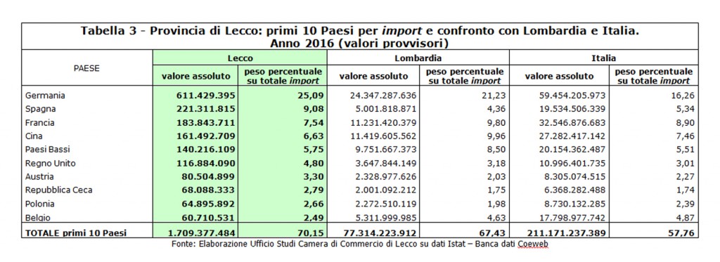 I principali Paesi da cui Lecco importa merci sono Germania (circa 611,4 milioni di Euro, pari al 25,1% dell’import totale), Spagna (circa 221,3 milioni di Euro, cioè il 9,1%), Francia (183,8 milioni di Euro, 7,5%), Cina (161,5 milioni di Euro, 6,6%) e Regno Unito (116,9 milioni di Euro, 4,8%)