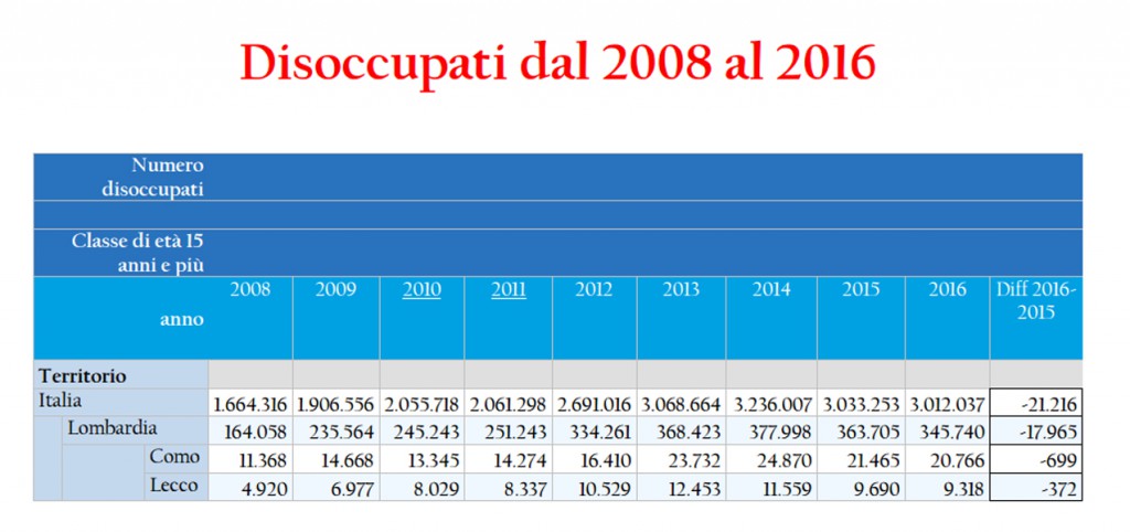 “Siamo ancora molto lontani da quella che era la situazione del 2008 – ricordano dalla Uil – anno inizio crisi economica: Como 11.368 unità e tasso di disoccupazione 4,23%; Lecco 4.920 unità e tasso di disoccupazione 3,20%”.