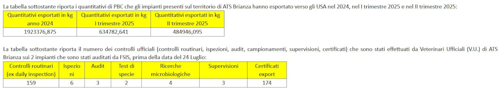 Per quanto riguarda Ats Brianza, sul cui territorio insistono 7 impianti abilitati ad esportare prodotti a base di carne verso gli Stati Uniti, il FSIS, che è l’organismo ufficiale pubblico americano con funzioni di controllo sulla salubrità e igiene degli alimenti, ha deciso di sottoporre ad audit i due impianti del Salumificio Fratelli Beretta a Garbagnate Monastero, dove si producono PBC a breve stagionatura, e a Barzanò, dove si produce mortadella.
