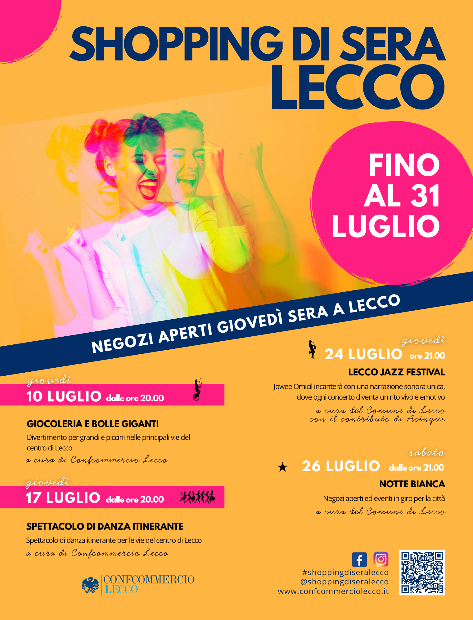 Shopping di Sera proseguirà per altri 3 giovedì di luglio fino al 31. Il 17 luglio è previsto, sempre dalle ore 20 e sempre a cura di Confcommercio Lecco, uno spettacolo di danza itinerante per le vie di Lecco. Giovedì 24 luglio, invece, all’interno del Lecco Jazz Festival, è in calendario il concerto di Jowee Omicii in piazza Garibaldi dalle ore 21. A sostegno dell’iniziativa sono attive anche le pagine Facebook e Instagram dedicate a Shopping di Sera Lecco 2025.