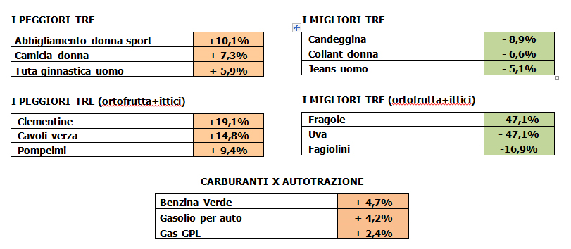 Questi i prodotti, a rilevazione locale e non centralizzata, che hanno avuto le peggiori variazioni e quelli che hanno registrato, invece, le migliori diminuzioni di prezzo rispetto al mese precedente: